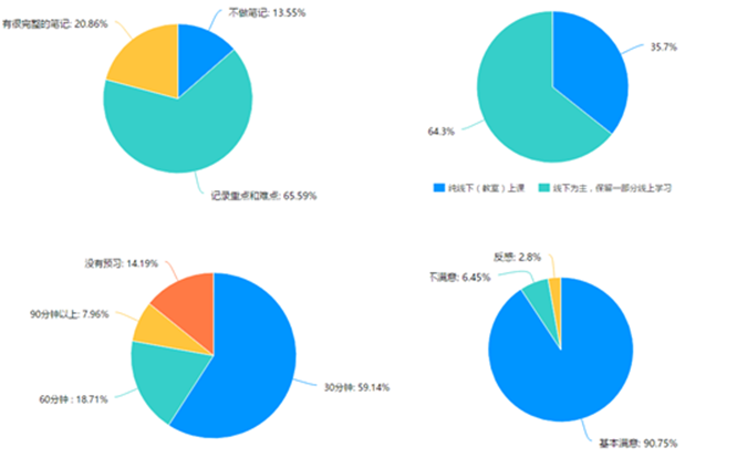 为全面掌握线上教态学情,中心开展了学生在线学习满意度调查工作。调查内容涉及“线上学习情况”“学习满意度”“对教学及管理的建议”等三个方面15个问题,较全面地反映了工业中心学生线上学习的主要情况。调查对象为2017-2019级全体本科学生,回收有效问卷近五百份。通过对调查结果分析,学生已经适应在线学习,并能够及时预习、按时完成每门功课的在线学习,91.8%的学生能按时参加每门课程的学习,86%的学生会做预习并在学习过程中做笔记, 97.75%的学生对在线教学表示满意和基本满意,并且64.3%的学生希望返校后能保留部分线上学习。