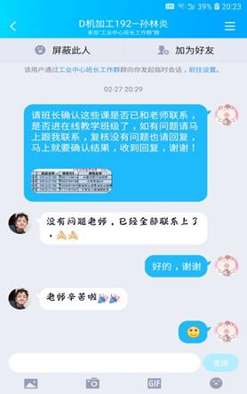 中心教学办通过QQ群布置和安排各类工作,讨论各阶段工作方案和思路,细化服务与管理,从教学安排、进度监管、教学督导等方面做好管理工作。开课前,对全校 141个班次的工程基础类课程、57个班次的实践课程、51个班次的专业课程、6个班级的毕业设计的在线教学任务做好落实。