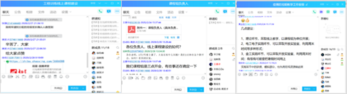 中心临时建立“疫情防控期教学工作安排”、“工程训练课程在线教学”、“电工电子类课程在线教学”等工作群,方便重要通知的发布和工作的交流讨论。