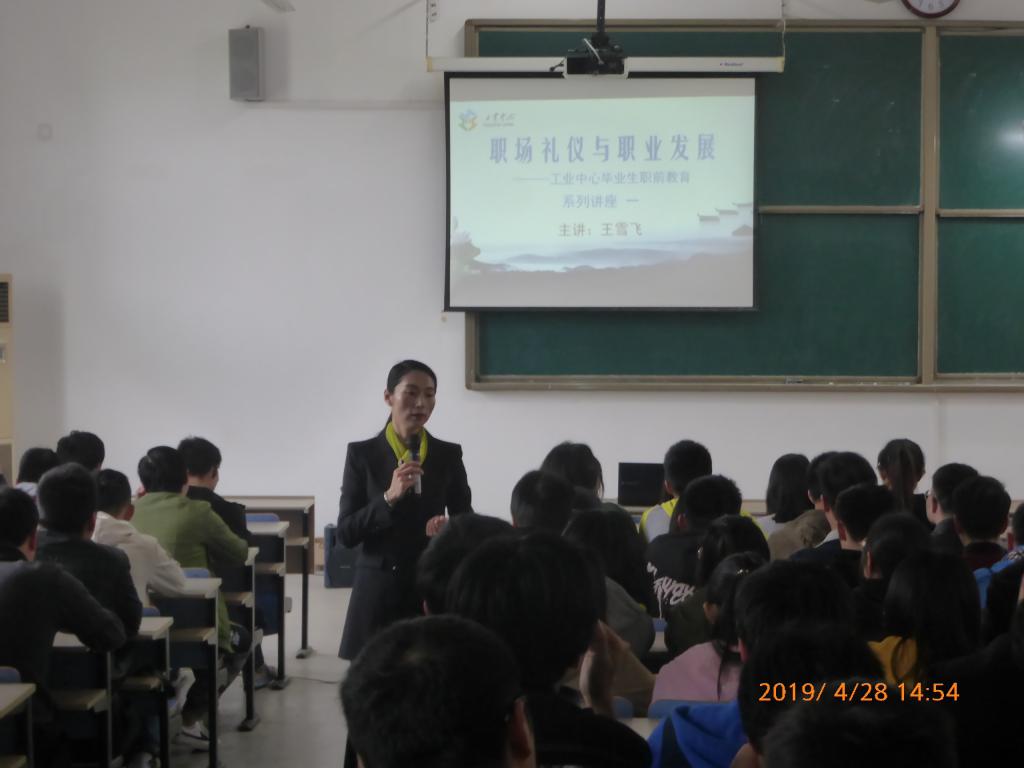 4月28日下午,工业中心毕业生职前教育第一场专题讲座在工程中心6号楼B211教室进行,中心党总支副书记兼副院长王雪飞为2019届全体毕业生做了题为“职场礼仪与职业发展”的专题讲座。
