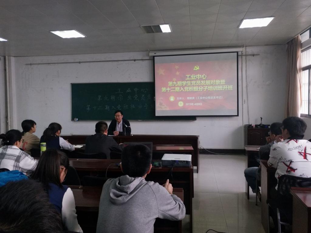为加强对学生党员发展对象及入党积极分子的培养和教育, 4月8日中午,工业中心分党校在至真苑基础实验楼B114会议室举行第九期学生党员发展对象暨十三期入党积极分子培训班开班仪式,中心党总支书记周明虎出席并作开班动员。