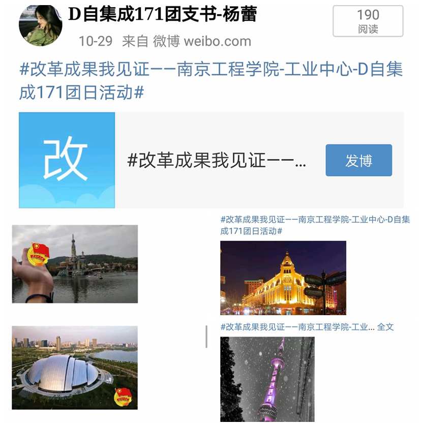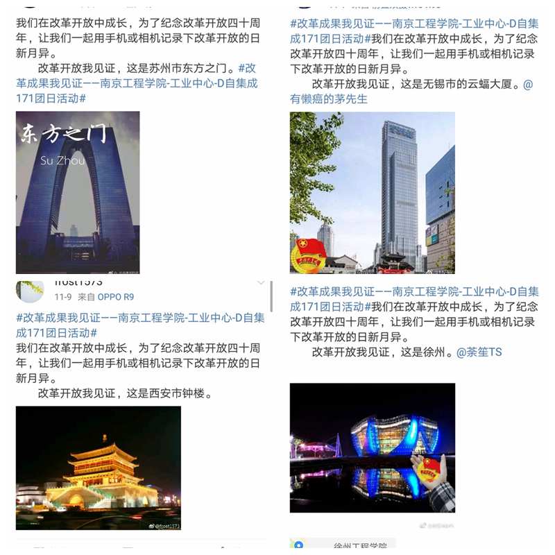中心D自集成171班团支部通过在线上发起微博话题讨论“改革成果我见证,这里是XX城市XX建筑物”,同时@其他城市的同学,将各个城市改革开放以来取得的巨大成就用镜头记录下来,让更多的同学共同了解并见证祖国四十年来发生的巨大变化。话题发起后,吸引了上海、深圳、西安、南京、重庆、天津、哈尔滨、苏州、无锡、徐州、常州、徐州、合肥等全国十三个城市学子的接力,上海东方明珠电视塔、苏州东方之门、合肥大剧院等各地的标志性建筑纷纷在话题传递中予以呈现,记录着各地在党的领导下取得的巨大成果。