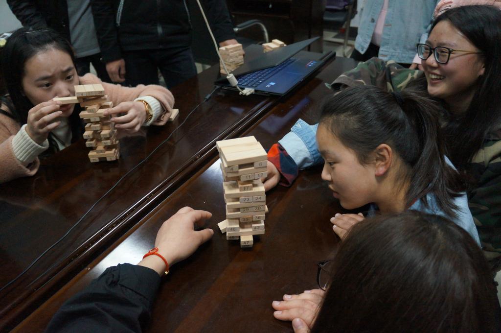 活动共有三项内容:“谁是卧底”、“传声筒”和“叠叠高”等。参与的女生们被分成六组,以组为单位开展活动。“谁是卧底”游戏中参与的女生们有一名“卧底”,几轮下来坚持到还剩三位同学时获胜。“传声筒”游戏则是挑战女生们之间的观察能力、领悟能力和彼此间的默契程度,需要戴耳机准确地猜出另一位同学描述的事物。“叠叠高”游戏要求把一块块积木垒起来,垒的最高的同学获胜,这个游戏对参与同学的细心和耐心要求很高。现场的女生们都非常投入地参与到游戏中。安静的教室里中不时传出女生们欢乐的笑声,在参与游戏的同时也放松了她们的身心。“能够在繁重的课业中暂时解放出来尽情放松,也是非常不错的,希望以后多举办此类关爱女生的活动”。一位参与活动的女生结束时如是说。