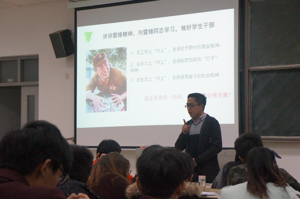 夏炜炜同学向在场的学生干部分享了自己在班级及学生会的工作经验及心得体会。他首先为大家分享了雷锋精神,认为做好学生干部应该具有这种无私的奉献精神。接着,他分享了自己 “三个向上”的体会,一是在工作上“向上”,即要发扬忠于职守的敬业精神;二是在学习上“向上”,即要发扬刻苦钻研的“钉子”精神;三是在生活上“向上”,即要发扬艰苦奋斗的创业精神。他引用“我是革命的一块砖,哪里需要往哪里搬”强调了学生干部绝对服从的重要性。最后,他提醒大家要努力做到“四勤”,即勤奋学习、勤于助人、勤劳勇敢、勤勉虚心。