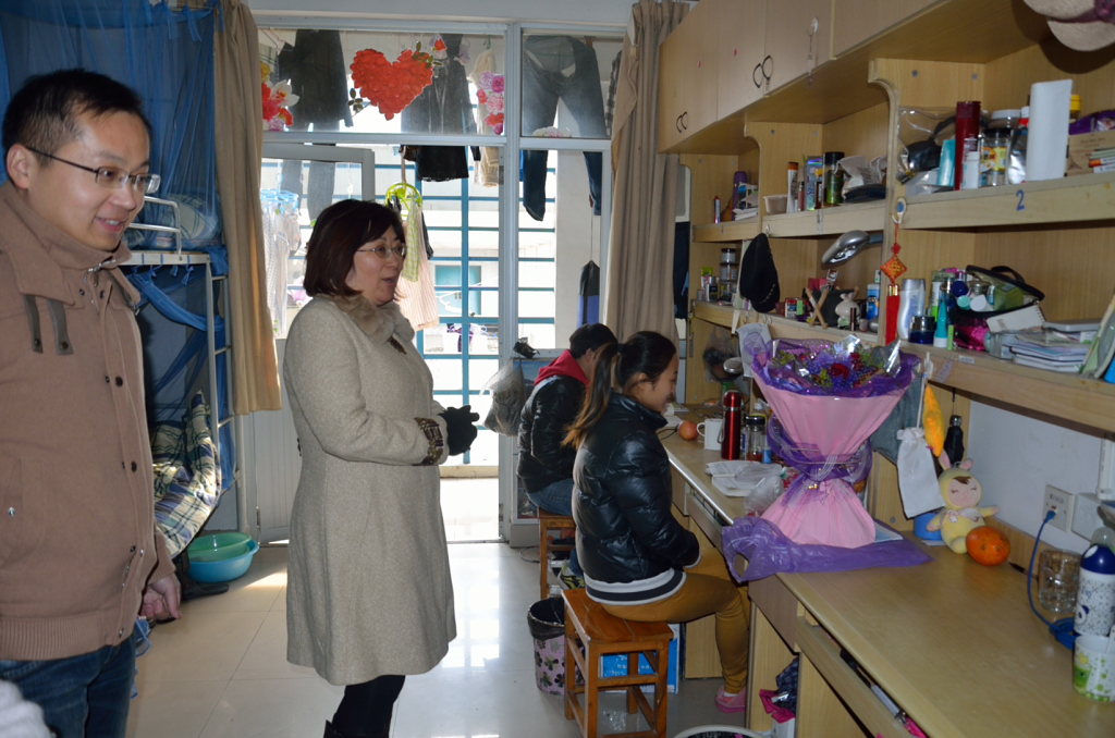 27日下午,党总支副书记王灿带领学工办全体辅导员走访了学生宿舍,并为优秀宿舍挂牌,同时前往的还有学生会生活部和青支队成员。在北区1号站女生宿舍,王书记与学生亲切交谈,询问了大家的学习生活状况,对整洁漂亮的宿舍环境表示赞赏。
