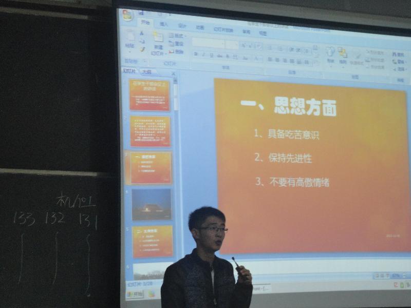 班委作为班级的负责人,应学会如何协调好工作与学习;在日常生活中,应关心同学,将班级凝聚成一个大集体会上,两位同学结合自身的经历,向13级新班委“传道授业”。他们指出班委要强调理论与实践相结合的重要性以及自我控制力与自觉性。