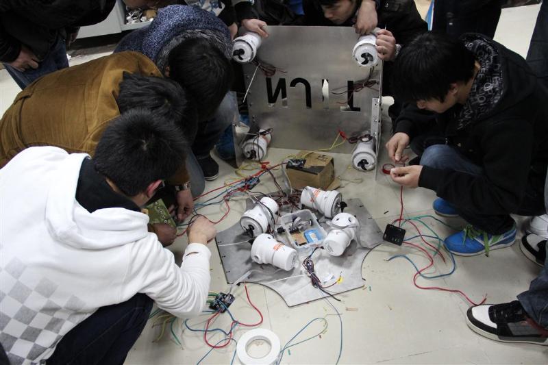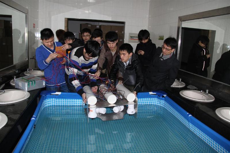 我校学生与年初组队准备参加2013年的竞赛,因首次参加,时间紧、任务重,没有任何经验,会遇到各种各样的问题,如电气控制部分防水,机器人手腕用力在水中开门、转动,保持机器人平衡等。但是,参加比赛的水下机器人创新小组同学,不怕困难,在智能机器人团队老师的指导下,目前正在不分昼夜的加紧设计、制作与测试,熬夜已经变成一种习惯。尽管在设计与制作过程中遇到了很多困难,但大家精诚合作、齐心协力,遇到问题,大家都会商讨解决,争取在国际比赛中取得好成绩。