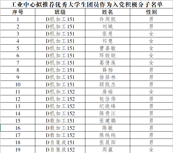 根据校团委通知及2017年《学生手册》第85页《南京工程学院推荐优秀大学生团员作为入党积极分子工作细则》,经各团支部申报、分团委审核,拟推荐D机加工151许周凯等126位同学作为入党积极分子,现予以公示,具体名单如下: