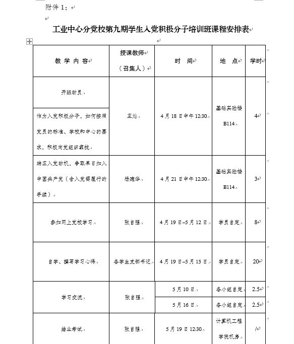 附件1:工业中心分党校第九期学生入党积极分子培训班课程安排表;