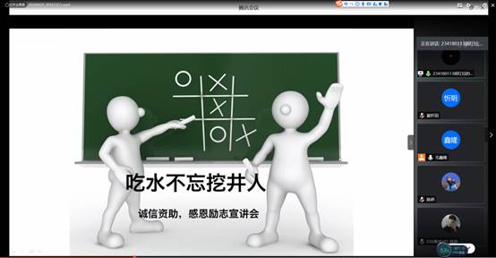 今年受疫情影响,非毕业班同学们不能返回校园,所以我中心在腾讯会议上采用线上宣讲的形式。本次活动邀请了三位接受了资助的同学作为本次会议的宣讲人,虽然活动的形式变了,但创新的活动方式取得良好的实效。为了确保会议能够顺畅的召开,让中心学生了解更多资助的相关政策,生活部毛鑫隆、胡继远做了大量的会议前期准备工作。宣讲会最后,我中心学工办参会老师就本次宣讲会的内容做了总结。呼吁大家远离不良贷、套路贷等。本次宣讲会圆满结束!!